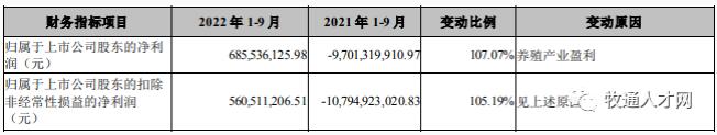 牧原:第三季實現(xiàn)營收365.06億元,同比增長147.60%,實現(xiàn)歸母凈利潤81.96億元,同比增長1097.41%。在第三季盈利良好的情況下,公司實現(xiàn)了前三季的扭虧,前三季歸母凈利潤15.12億元。