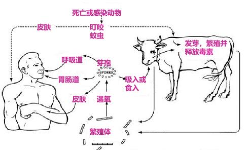 牛、羊等食草動(dòng)物是炭疽的易感動(dòng)物和主要傳染源。人主要通過接觸炭疽病畜、毛皮和食肉感染,也可通過吸入含有炭疽芽孢的粉塵或氣溶膠感染。當(dāng)前皮膚炭疽是最為常見的感染類型,及時(shí)治療一般預(yù)后良好。肺炭疽和腸炭疽目前發(fā)病非常少,但病死率非常高。