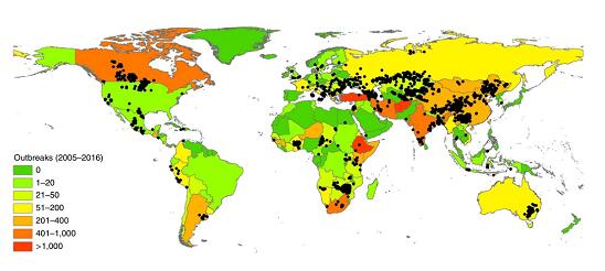 炭疽芽孢桿菌自然疫源地在全球分布廣泛,常見于農(nóng)牧業(yè)發(fā)達(dá)地區(qū)。目前沒有任何一個(gè)國家完全消滅炭疽,說明疫源地一旦產(chǎn)生后非常頑固。下圖展示了2005-2016年炭疽疫情全球分布圖(Carlson CJ, et al. Nat Microbiol, 2019),黑點(diǎn)代表1次疫情及其定位。