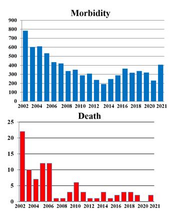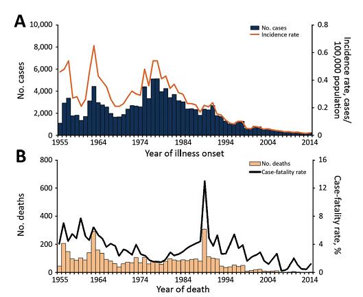 炭疽曾經(jīng)在我國廣泛流行,年度發(fā)病數(shù)千人,死亡上百人,90年代之后得到有效控制,疫情逐年下降,但仍在部分地區(qū)點(diǎn)狀、散發(fā)流行。下圖展示了從有記錄以來中國疫控中心總結(jié)的炭疽人員感染發(fā)病和死亡情況(Li Y, et al. Emerg Infect Dis, 2017)。