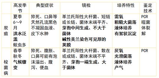 下表展示了炭疽和梭菌病的鑒別診斷,這兩種疾病的發(fā)病動(dòng)物都有突發(fā)死亡、天然孔出血和腹部膨脹等類似的臨床癥狀。