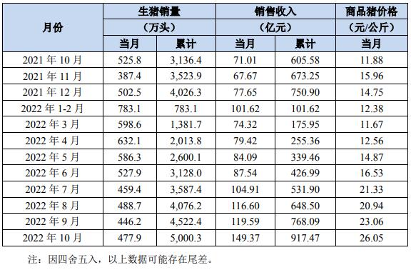牧原股份11月7日公布2022年10月份生豬銷售簡(jiǎn)報(bào)。10月份,公司銷售生豬477.9萬(wàn)頭(其中仔豬銷售18.5萬(wàn)頭),銷售收入149.37億元。其中向全資子公司牧原肉食品有限公司及其子公司合計(jì)銷售生豬61.2萬(wàn)頭。