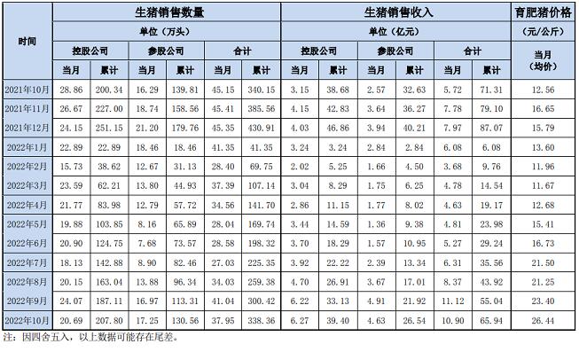 2022年1-10月,控股公司累計銷售生豬207.80萬頭,同比增長3.72%。累計銷售收入39.40億元,同比增長1.86%。