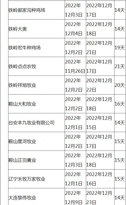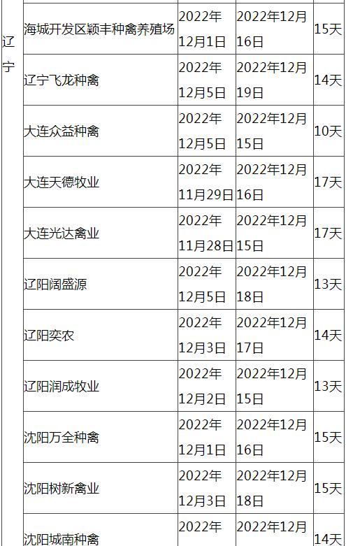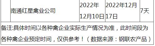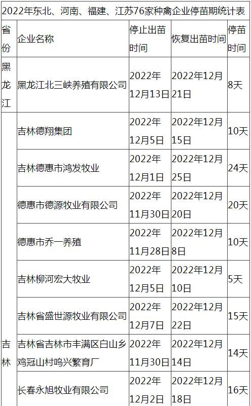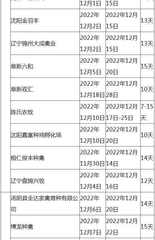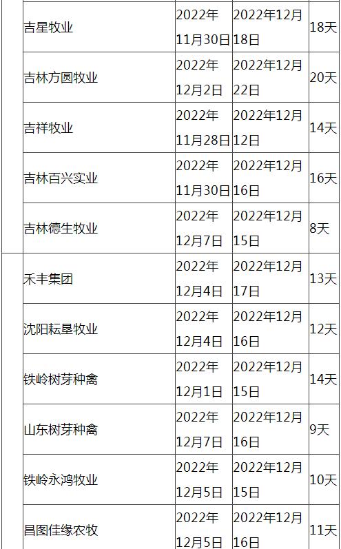 根據(jù)市場調(diào)研情況顯示,本次停苗時間最長在20天左右,最短7天左右,主要集中在12月上旬進行停止出苗(即屠宰企業(yè)農(nóng)歷臘月二十三左右停止宰殺),12月15日-20日進行恢復(fù)出苗(即屠宰企業(yè)農(nóng)歷2023年正月初八左右春節(jié)過后開工)。