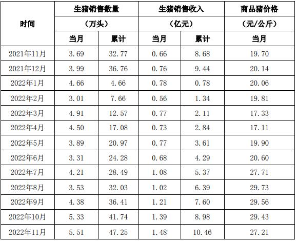 2022年11月份,公司商品豬銷售均價(jià)27.21元/公斤,環(huán)比下降7.53%。