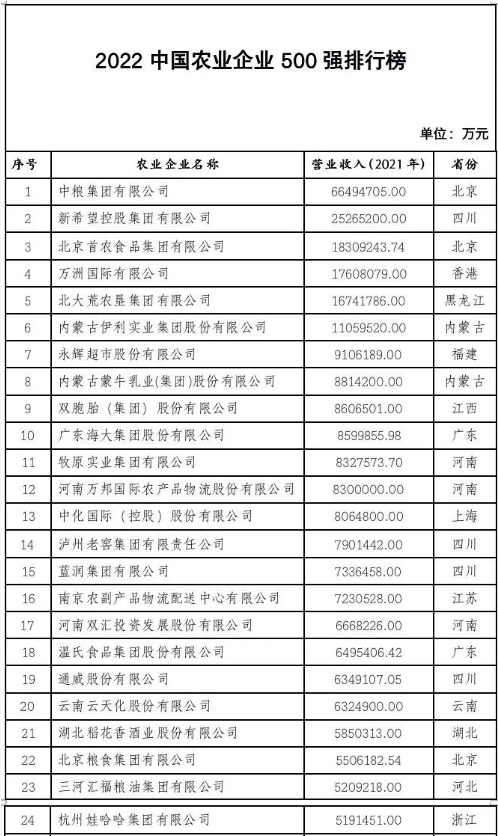 農(nóng)民日報社12月15日公布了《2022中國農(nóng)業(yè)企業(yè)500強》榜單,新希望、牧原、溫氏、海大、雙胞胎等農(nóng)牧企業(yè)上榜。
