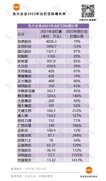新希望或?qū)⒃?023年首次跨入2000萬頭。傲農(nóng)生物今年力爭出欄550萬頭,2023年目標800萬頭,較2021年增長146%,其目標2024年達到1000萬頭出欄。