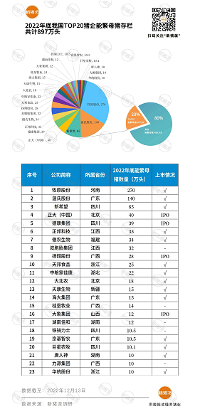 能繁母豬是養(yǎng)殖集團厚積薄發(fā)的核心資源。根據(jù)新豬派調(diào)研,截至2022年底,我國TOP20豬企共計手握897萬頭能繁母豬,約占全國總量的1/5。能繁母豬超過10萬頭的企業(yè)有23家。