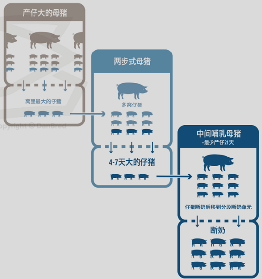 2、4到8天大的仔豬轉(zhuǎn)移到剛斷奶的母豬身邊,這種母豬已經(jīng)產(chǎn)仔21天左右了(中間哺乳母豬)。