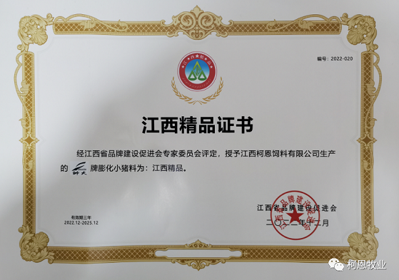 品牌價(jià)值是企業(yè)的無(wú)形資產(chǎn)??露黠暳弦再|(zhì)量穩(wěn)定著稱市場(chǎng),截止目前,已有4件江西省名牌產(chǎn)品。集團(tuán)經(jīng)典產(chǎn)品——膨化小豬料,更是好評(píng)如潮,深受養(yǎng)豬戶的喜愛(ài)并得到廣大養(yǎng)豬同行的高度認(rèn)可,被認(rèn)定為首屆“江西精品”(2022年度,全省只有20件產(chǎn)品獲此殊榮),入選《2022年度贛州市名優(yōu)創(chuàng)新產(chǎn)品推薦目錄(第一批)》。