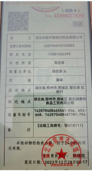 出欄前,碧石渡鎮(zhèn)畜牧站在現(xiàn)場對上市金豬的健康狀態(tài)和免疫疫苗注射等情況進行了檢查,138頭金豬平均重量達到了301斤,經(jīng)檢測,全部達到了出欄的標準,并現(xiàn)場開具了三臺車輛出豬的檢疫票。