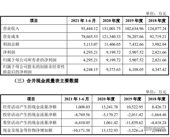2018年、2019年、2020年、2021年1-6月,播恩集團(tuán)營業(yè)收入分別為124,077.24萬元、102,634.96萬元、151,001.75萬元、93,444.12萬元;凈利潤、歸屬于母公司所有者的凈利潤分別為2,821.66萬元、5,907.52萬元、9,199.72萬元、4,295.21萬元;歸屬于母公司股東的扣除非經(jīng)常性損益后的凈利潤分別為4,347.42萬元、6,108.05萬元、9,373.63萬元、4,248.15萬元。