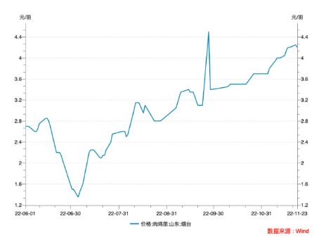 白羽肉雞苗價格自7月上旬攀升至成本線之上后,一路震蕩上行,不斷破紀錄。進入11月,價格一度高達4.7元/羽。而年初時,某大型白羽肉雞企業(yè)官網(wǎng)雞苗報價僅為1.7-1.9元/羽,年內(nèi)種雞身價漲超147%。