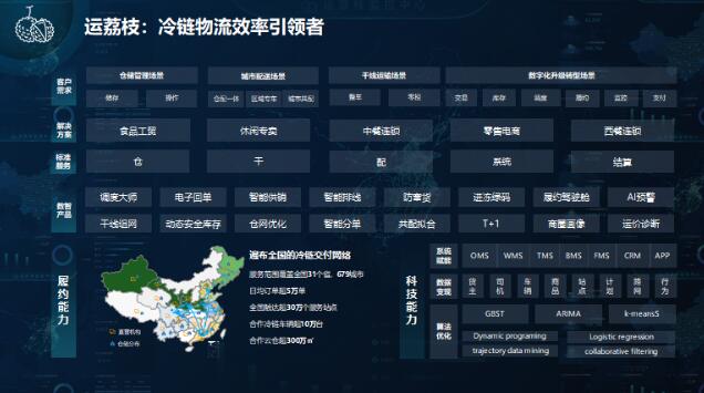 在物流配送上,有全國(guó)領(lǐng)先的鮮生活冷鏈物流,通過(guò)一款“運(yùn)荔枝”軟件,制定一體化的供應(yīng)鏈交付解決方案?!斑\(yùn)荔枝”提供的服務(wù),包括了運(yùn)力推薦、電子回單、定存管理、智能排線、AI預(yù)警、倉(cāng)孿生、倉(cāng)網(wǎng)優(yōu)化、食安溯源、然后商圈畫(huà)像等等。