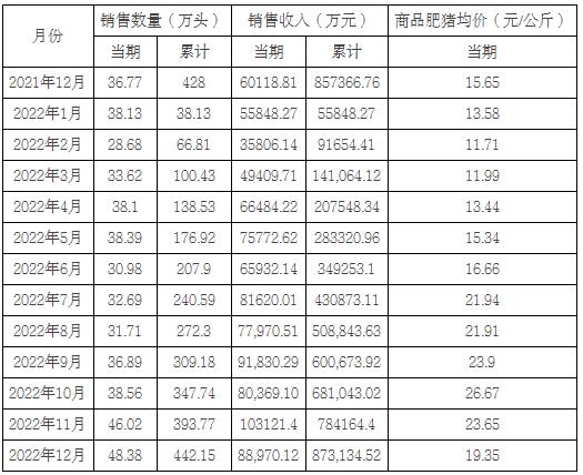 參股公司史記生物技術(shù)(南京)有限公司及安徽農(nóng)墾漢世偉和安食品有限公司2022年12月份銷售各類商品豬合計77,176頭。