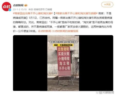 1月3日下午,極目新聞記者撥通了該商戶電話。他稱,淘汰豬售價(jià)3元每斤,是活豬,“不開心豬”則是生病的豬,在處理廠處理了,是死亡了的。該商戶稱不知道“不開心豬”生了什么病。