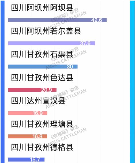 甘孜州10個(gè):甘孜州白玉縣10.5萬頭,甘孜州德格縣15.7萬頭,甘孜州康定市11.9萬頭,甘孜州理塘縣16.8萬頭,甘孜州爐霍縣13.5萬頭,甘孜州色達(dá)縣20.1萬頭,甘孜州色達(dá)縣20.9萬頭,甘孜州石渠縣29.2萬頭,甘孜州石渠縣30萬頭,甘孜州新龍縣10.1萬頭。