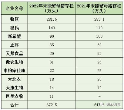 與2021年同期相比,目前能繁母豬存欄超百萬頭的企業(yè)只有牧原、溫氏2家,其中,牧原股份以年末能繁母豬存欄281.5萬頭的成績遙遙領(lǐng)先,盡管略低于2021年283.1萬頭的水平,但依然保持了斷層第一。