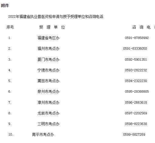 附件 :2022年福建省執(zhí)業(yè)獸醫(yī)資格申請與授予受理單位和咨詢電話