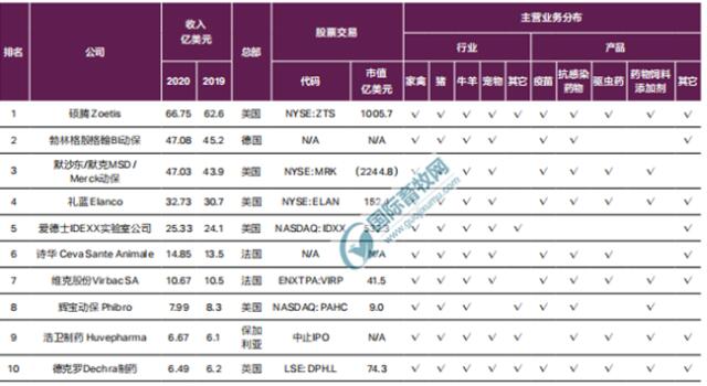 從前 10 強(qiáng)企業(yè)來看,總部均設(shè)在歐美,美國(guó)占一半。2020年,這10家企業(yè)市場(chǎng)份額占比58.50%,較2019年的55.57%增加約3個(gè)百分點(diǎn),位次順序大致未變(除浩衛(wèi)制藥晉級(jí)第9位、詩華、維克各前進(jìn)1位外),以及禮藍(lán)在2020年8月1日完成對(duì)拜耳動(dòng)保的收購(gòu),其2020年收入略增但排名未變。