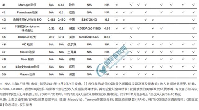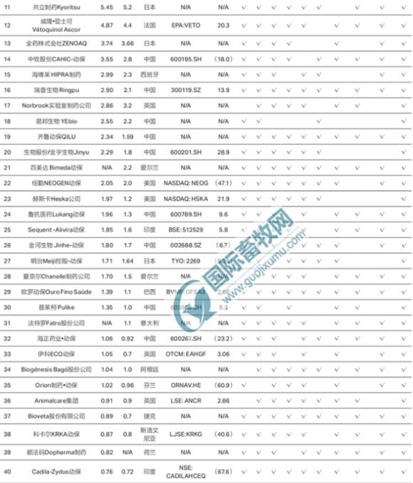 十家中國(guó)企業(yè)入圍,分別為:中牧股份(2020年收入為3.55億美元)、瑞普生物(2020年收入為2.90億美元)、易邦生物(2020年收入為2.55億美元)、齊魯動(dòng)保(2020年收入為2.34億美元)、金宇生物(2020年收入為2.29億美元)、魯抗醫(yī)藥(2020年收入為1.96億美元)、金河生物(2020年收入為1.80億美元)、普萊柯(2020年收入為1.35億美元)、海正藥業(yè)(2020年收入為1.06億美元)、永順生物(2020年收入為0.483億美元)。這10家企業(yè)2020年收入總計(jì)20.29億美元。根據(jù)中國(guó)獸藥協(xié)會(huì)公布的數(shù)據(jù),2020年國(guó)內(nèi)獸藥產(chǎn)品銷售規(guī)模為620.95億元。粗略估計(jì),中國(guó)動(dòng)保前十企業(yè)收入約占全國(guó)獸藥產(chǎn)品收入20.83%。