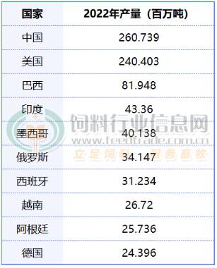 2022年十大飼料生產(chǎn)國共生產(chǎn)飼料8.088億噸,占全球飼料總產(chǎn)量的64%,中國、美國、巴西以及印度這前四名國家的飼料產(chǎn)量占總量的一半,中國第一的位置仍無法撼動,越南在2022年經(jīng)歷了大幅復(fù)蘇,排在阿根廷和德國之前進(jìn)入前十名,而2021年上榜的日本、土耳其此次未進(jìn)入前十名。俄羅斯超過了西班牙,后者的飼料產(chǎn)量大幅減少。