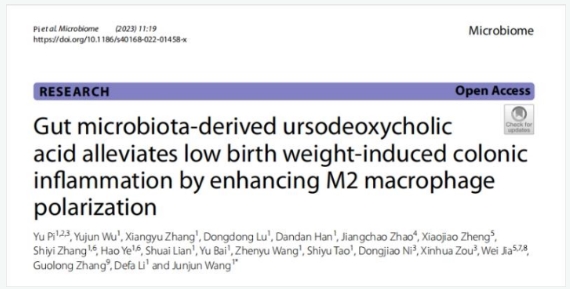 在養(yǎng)豬生產中,宮內生長受限(Intrauterine growth restriction, IUGR)豬的發(fā)生率高達20%,其導致仔豬出生重低以及繼發(fā)的哺乳期高死亡率和全期低生長性能,是養(yǎng)豬業(yè)目前存在的突出問題之一。前期的研究結果顯示,IUGR導致的仔豬低出生體重(LBW)與出生后腸道炎癥狀態(tài)密切相關。然而,關于LBW導致腸道炎癥發(fā)生發(fā)展的分子機制尚不清楚。為此,《腸道微生物代謝產物熊脫氧膽酸通過促進腸道M2型巨噬細胞極化緩解低出生重仔豬結腸炎癥》研究綜合運用靶標膽汁酸代謝組和微生物組學技術、糞菌移植和巨噬細胞清除等研究手段,探究了膽汁酸(BAs)在LBW新生仔豬誘導腸道炎癥中的介導作用及其分子機制。