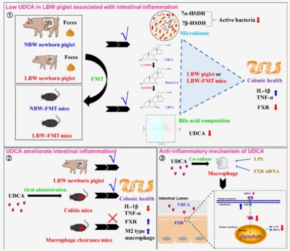 研究結果顯示,LBW和正常出生體重新生仔豬的糞便微生物組和BAs分布均存在顯著性差異,特別是熊脫氧膽酸(UDCA)在LBW仔豬腸道中顯著降低,并伴隨著與UDCA合成相關菌群的豐度降低,如7α-羥基類固醇脫氫酶(7α-HSDH)和7β-羥基類固醇脫氫酶(7β-HSDH)(這些微生物能夠將腸道中的鵝脫氧膽酸CDCA轉化為UDCA)。進一步將LBW新生仔豬的糞菌移植到抗生素清菌后的小鼠體內,可導致受體鼠腸道炎癥增強、腸道中UDCA含量降低、7α-HSDH和7β-HSDH相關膽汁酸代謝菌的豐度降低。重要的是,口服UDCA(在LBW仔豬腸道中減少的主要膽汁酸)可通過促進巨噬細胞向M2型極化從而顯著緩解LBW仔豬、LBW-FMT受體小鼠和結腸炎造模小鼠的腸道炎癥。在分子機制上,UDCA是通過與BAs受體法尼醇受體(FXR)結合、抑制巨噬細胞中NF-κB信號通路的活化,從而減少腸道炎性細胞因子的產生。