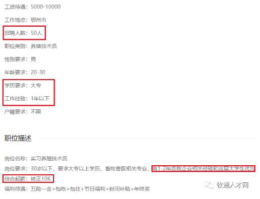 除去你耳熟能詳?shù)拿?,法庫縣鴻豐牧業(yè)有限公司在招1位養(yǎng)豬技術員,標出綜合工資1-2萬,但據(jù)職位描述看起來還是對標場長職責,不過與大場相比求職門檻較低,大專以上學歷有二年以上相關工作經(jīng)驗即可。