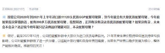 正邦科技2月6日在回復(fù)投資者提問時(shí)表示,截至2022年12月,公司的能繁種群中大部分為進(jìn)口優(yōu)質(zhì)母豬后代。21年末受生豬價(jià)格持續(xù)低迷及持續(xù)虧損影響,公司對能繁種群做了進(jìn)一步壓縮,以適配外部行情和自身經(jīng)營的需要,當(dāng)前生產(chǎn)經(jīng)營以穩(wěn)步發(fā)展為核心,整體產(chǎn)能相對穩(wěn)定。