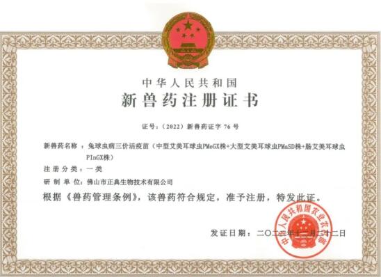 在這樣的背景下,2003年正典生物啟動(dòng)了雞球蟲(chóng)病疫苗的研制,歷經(jīng)5年攻堅(jiān)克難,正典球苗®-4(雞球蟲(chóng)病四價(jià)活疫苗)2007年獲得國(guó)家新獸藥證書(shū),2008年正典生物建成亞洲首家寄生蟲(chóng)疫苗車間并獲得農(nóng)業(yè)部批準(zhǔn)文號(hào)成功上市。