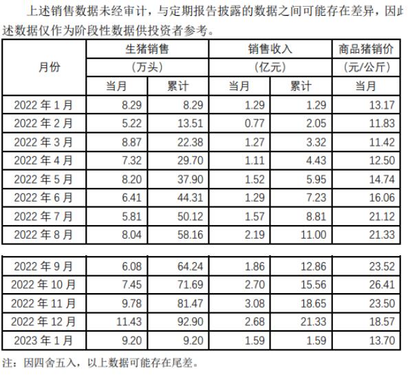 2023年1月份,公司銷售生豬9.20萬頭(其中商品豬銷售9.06萬頭),銷售收入1.59億元。其中向集團(tuán)內(nèi)部屠宰企業(yè)銷售生豬1.61萬頭。