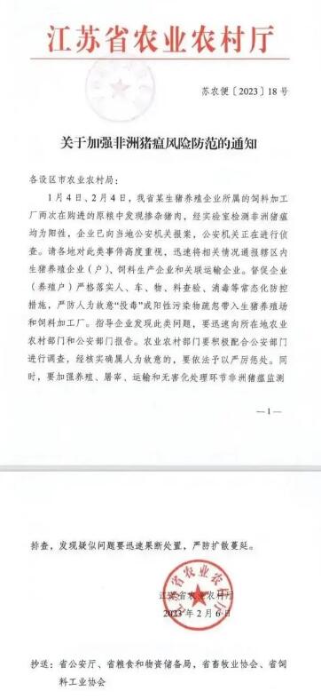 通知稱,1月4日、2月4日,江蘇省某生豬養(yǎng)殖企業(yè)所屬的飼料加工廠兩次在購進(jìn)的原糧中發(fā)現(xiàn)摻雜豬肉,經(jīng)實(shí)驗(yàn)室檢測非洲豬瘟均為陽性,企業(yè)已向當(dāng)?shù)毓矙C(jī)關(guān)報(bào)案,公安機(jī)關(guān)正在進(jìn)行偵查。
