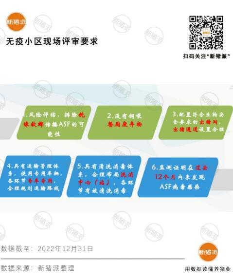 無疫小區(qū)更加有利于畜禽跨區(qū)流動(dòng),減少疫病傳播風(fēng)險(xiǎn),同時(shí)為未來參與國際貿(mào)易打下基礎(chǔ)。農(nóng)業(yè)農(nóng)村部也進(jìn)一步完善落實(shí)了非瘟無疫小區(qū)的推進(jìn)標(biāo)準(zhǔn)以及相關(guān)政策。明確各級主體的職責(zé)與分工。確定了評估步驟以及相關(guān)標(biāo)準(zhǔn)。