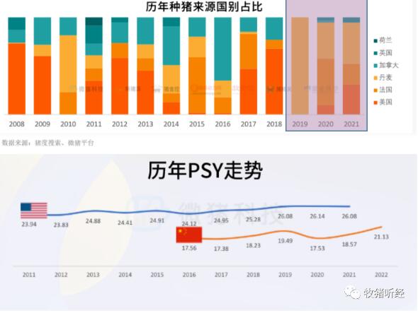 筆者現在分析,原因主要有以下兩點:第一,我國自詡為養(yǎng)豬大國,但并非養(yǎng)豬強國。我們經常拿自己的生產指標和國外對比,首先提及的便是PSY\MSY。追求高產,在國內養(yǎng)豬人心中根深蒂固,為此,近些年養(yǎng)丹系、法系的多了,美系的比例在下降,行業(yè)高產品系占比的提升,無形中提升了生豬的產量。這個似乎不需要太多技術含量,基因強大,這個你擋不住,遇上管理好的,成活率更高,你說這個對產能的貢獻有沒有影響?讓我們看一下,非瘟后,國內的引種品系結構,你或許能感知一二。第二,非瘟后,規(guī)模化占比的快速提升,進一步提高了行業(yè)的生產效率,行業(yè)整體養(yǎng)殖水平對比非瘟前上了一個新的臺階,工業(yè)化、科技智能養(yǎng)豬的推廣和應用,無疑給這個行業(yè)注入了加速器,減少了對人的依賴,尤其是有經驗的人。這也就不難解釋規(guī)模擴張的背后,行業(yè)生產效率在短時間內得到了穩(wěn)步提高,非瘟的影響幾乎可以忽略不計了。也許這個行業(yè)未來對有經驗的人的需求變并不那么迫切了,不是不需要,而是不需要那么多了,技術的革新,科技的進步對養(yǎng)豬業(yè)的改變讓我們迎來了新的時代。近期火熱的ChatGPT就是這個道理。
