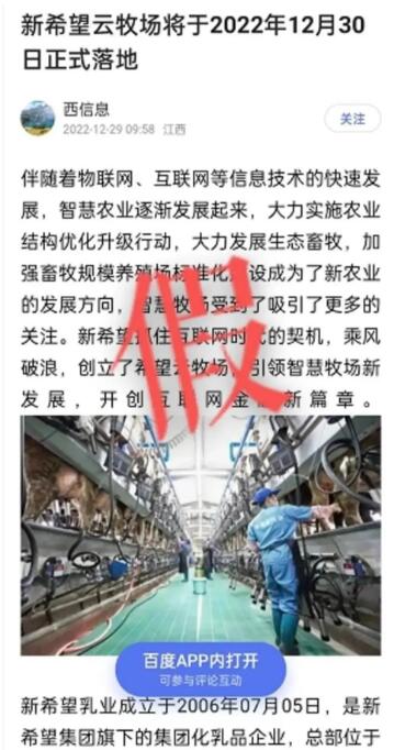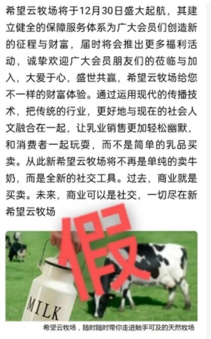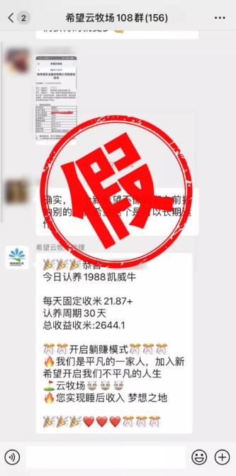 2月13日,新希望乳業(yè)官方微信發(fā)布公告稱,近日有不法分子假冒新希望乳業(yè)名義,以“認(rèn)養(yǎng)?!钡耐顿Y理財(cái)形式進(jìn)行詐騙活動(dòng)。騙子通過網(wǎng)絡(luò)宣傳,以假亂真,預(yù)計(jì)已有部分市民“中招”。