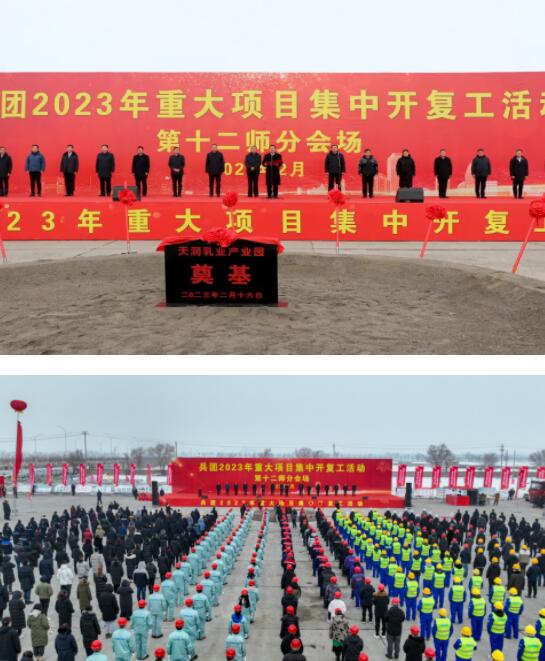 為加快重點(diǎn)項(xiàng)目建設(shè),實(shí)現(xiàn)首季“開(kāi)門(mén)紅”, 2月16日下午,兵團(tuán)舉辦2023年重大項(xiàng)目集中開(kāi)復(fù)工儀式,第十二師分會(huì)場(chǎng)設(shè)在天潤(rùn)乳業(yè)年產(chǎn)20萬(wàn)噸乳制品加工項(xiàng)目現(xiàn)場(chǎng)。兵團(tuán)黨委常委、副政委,兵團(tuán)黨委組織部部長(zhǎng)張文勝,兵團(tuán)交通運(yùn)輸局黨組書(shū)記秦偉,十二師黨委書(shū)記、政委李斌,師黨委副書(shū)記、師長(zhǎng)侯國(guó)俊等兵師領(lǐng)導(dǎo)出席十二師開(kāi)復(fù)工儀式。五一農(nóng)場(chǎng)、三坪農(nóng)場(chǎng)、天潤(rùn)乳業(yè)、國(guó)資公司等單位領(lǐng)導(dǎo)及職工代表近500人參加啟動(dòng)儀式。