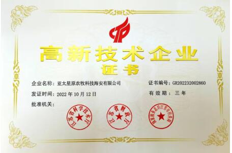 ??日前,據高新技術企業(yè)認定管理工作網相關公告,亞太星原農牧科技海安有限公司(以下簡稱:亞太星原)順利通過每3年一次的高新技術企業(yè)重新認定,正式收到由江蘇省科學技術廳、江蘇省財政廳、國家稅務總局江蘇省稅務局聯合頒發(fā)的《高新技術企業(yè)證書》(證書編號:GR202232002860)。這一“國字號”榮譽在亞太星原的成功延續(xù),意味著亞太星原在研發(fā)創(chuàng)新等方面的實力得到了社會各界的持續(xù)性高度認可。