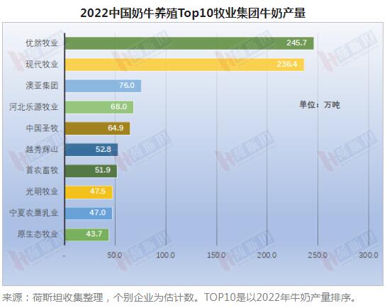 2022牧業(yè)集團(tuán)Top10牛奶產(chǎn)量934萬(wàn)噸,較2021年TOP10牧業(yè)集團(tuán)產(chǎn)量增加18%;據(jù)荷斯坦估計(jì),TOP10牧業(yè)集團(tuán)產(chǎn)量約占全國(guó)商品牛奶產(chǎn)量的1/3。