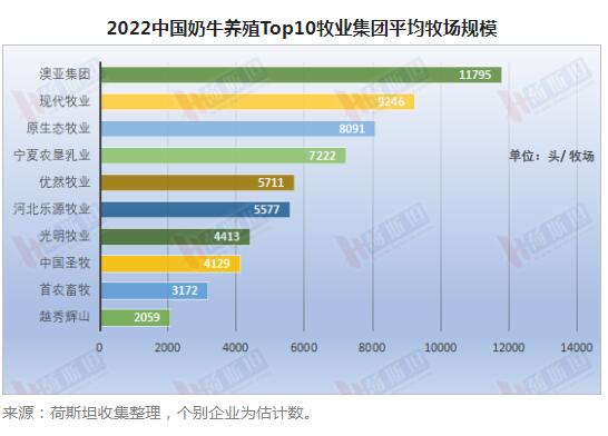 平均規(guī)模超過(guò)5400頭,比2021年提高11%,大型牧場(chǎng)是集團(tuán)牧場(chǎng)的主流 澳亞集團(tuán)牧場(chǎng)平均存欄11795頭,位居第一,平均規(guī)模都超過(guò)8000頭的集團(tuán)有:現(xiàn)代牧業(yè)為9246頭,原生態(tài)牧業(yè)為8091頭,分居第二、第三。