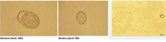 據(jù)報道,全球至少有20多種不同的艾美耳球蟲,其中在我國能分離出來的球蟲種類有12種以上。但不同的球蟲種類致病性不一樣,有些甚至沒有致病性,所以在檢測糞便中球蟲卵囊過程中需要有專業(yè)的知識,尤其需要專業(yè)的檢測機(jī)構(gòu)判斷牧場感染的球蟲種類。目前在牧場最常見、致病性最強(qiáng)的球蟲種類是牛艾美耳球蟲和邱氏艾美耳球蟲,國外放牧條件下會有阿拉巴艾美耳球蟲。