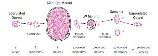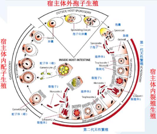 整個循環(huán)中體內(nèi)的增殖階段需要多少天呢?因為不同球蟲種類的感染性卵囊從被食入體內(nèi)到排出新的卵囊的周期不一樣,平均是21天。體外的生殖階段時間不確定,溫度越高、濕度越大,從非感染性到感染性卵囊時間就相對較短,可能1-2天,甚至1天。