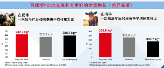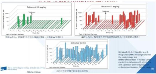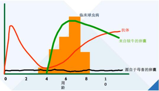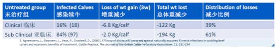 實驗選取231頭3-16周齡(平均1.5個月)犢牛,分成2組,其中治療組116頭,未治療組115頭,治療組3周后監(jiān)測糞便卵囊生成和增重的情況。實驗結(jié)果發(fā)現(xiàn),通過治療增重增加了20%,卵囊減少了99%,效果比較明顯。