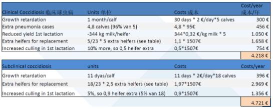 國外有研究報道,有球蟲亞臨床感染的犢??梢詫?dǎo)致35天的嚴(yán)重生長遲緩,與對照治療組日增重 870克相比,受感染犢牛日增重僅600 克,這相當(dāng)于9.45公斤的生長遲緩??紤]到 6月時體重與初產(chǎn)年齡之間的關(guān)系,后者將增加 0.9個月的飼養(yǎng)時間,從而增加飼養(yǎng)成本。