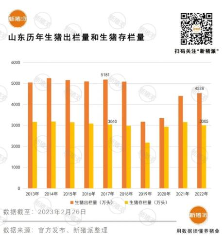 非洲豬瘟對山東養(yǎng)豬業(yè)的影響深遠。數據顯示,非瘟前山東生豬年出欄量超過5000萬頭,2019年大幅下滑至3176萬頭。2022年,山東出欄生豬4528萬頭,同比增長2.9%,僅為2017年的87%。
