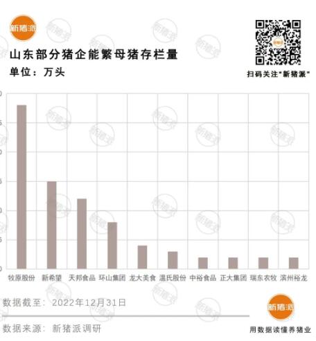 在非瘟、行情等沖擊下,山東養(yǎng)豬業(yè)迎來結構調整,2022年龍頭企業(yè)出欄占比超35%,10家規(guī)模豬企合計持有能繁母豬近80萬頭,占全省27%,其中牧原、新希望、天邦數量排名前三。