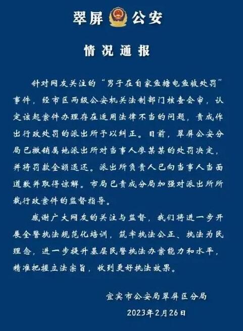 針對網(wǎng)友關(guān)注的“男子在自家魚塘電魚被處罰”事件,經(jīng)市區(qū)兩級公安機關(guān)法制部門核查會審,認定該起案件辦理存在適用法律不當?shù)膯栴},責成作出行政處罰的派出所予以糾正。目前,翠屏公安分局已撤銷屬地派出所對當事人廖某某的處罰決定,并將罰款全額退還。派出所負責人已向當事人當面道歉并取得諒解。市局已責成分局加強對派出所所裁行政案件的監(jiān)督指導。