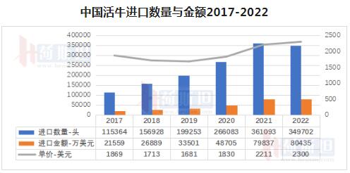 2022全年進(jìn)口活牛34.97萬(wàn)頭,同比去年36.11萬(wàn)頭減少3%,活牛到岸價(jià)平均2300美元/頭,同比去年上漲4%。