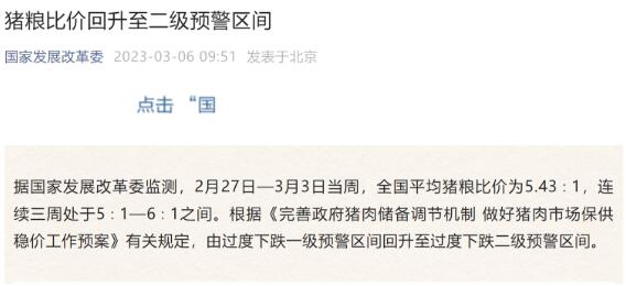 發(fā)改委3月6日消息,據(jù)國家發(fā)展改革委監(jiān)測,2月27日—3月3日當(dāng)周,全國平均豬糧比價(jià)為5.43∶1,連續(xù)三周處于5∶1—6∶1之間。根據(jù)《完善政府豬肉儲備調(diào)節(jié)機(jī)制 做好豬肉市場保供穩(wěn)價(jià)工作預(yù)案》有關(guān)規(guī)定,由過度下跌一級預(yù)警區(qū)間回升至過度下跌二級預(yù)警區(qū)間。