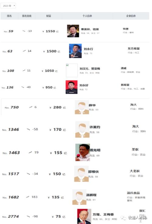 近日,胡潤研究院發(fā)布《2023全球富豪榜》,中國有13位農(nóng)牧業(yè)企業(yè)家上榜,分別是牧原股份的秦英林夫婦、東方希望劉永行、通威股份劉漢元夫婦、新希望集團(tuán)劉永好、海大集團(tuán)薛華,許英灼、圣農(nóng)集團(tuán)傅光明、大北農(nóng)集團(tuán)邵根伙、溫氏食品溫鵬程以及雙匯集團(tuán)萬隆夫婦。